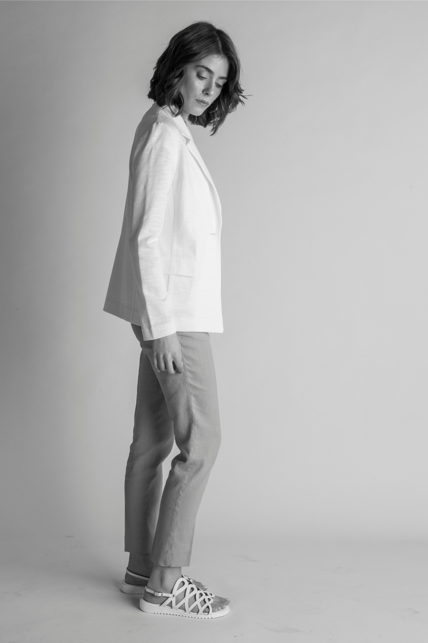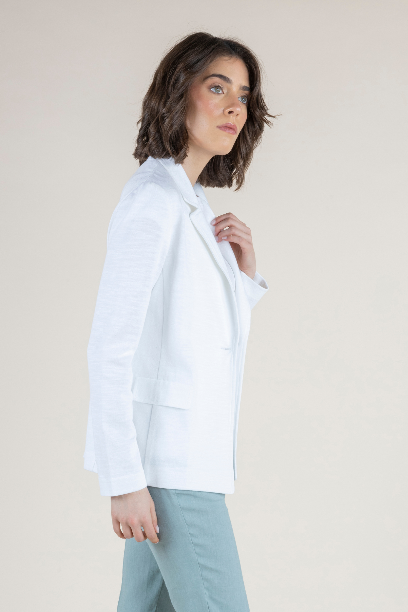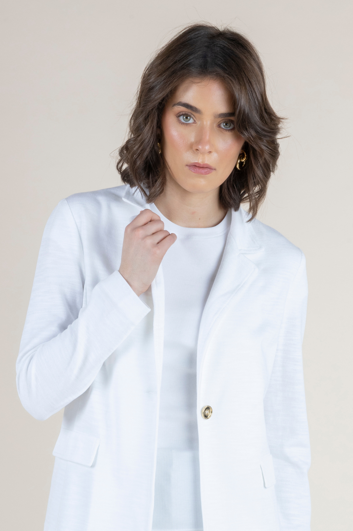 Crisp, refined, and effortlessly polished, the Superman Jacket is a modern essential designed to elevate everyday dressing. Tailored in a flattering waist-length silhouette, this sleek white jacket features a clean, structured shape that enhances the natural form while maintaining a lightweight, breathable feel for warmer days. A single gold button closure adds a subtle touch of sophistication, while flap pockets and sharp lapels create a timeless, tailored finish. The streamlined, form-fitting design makes it endlessly versatile — perfect layered over a tee, paired with tailored trousers, or styled with relaxed spring separates. Chic yet practical, the Superman Jacket is a warm-weather staple that delivers effortless elegance wherever the day takes you