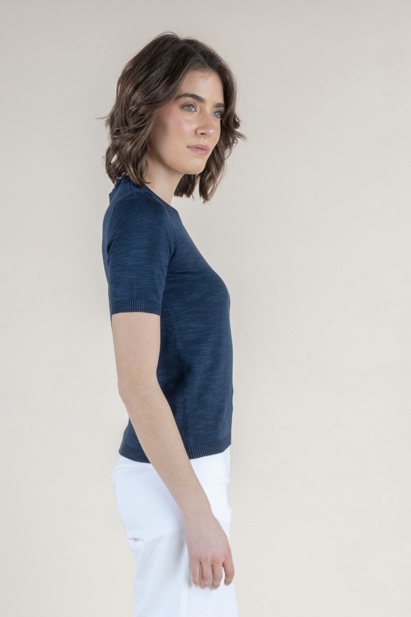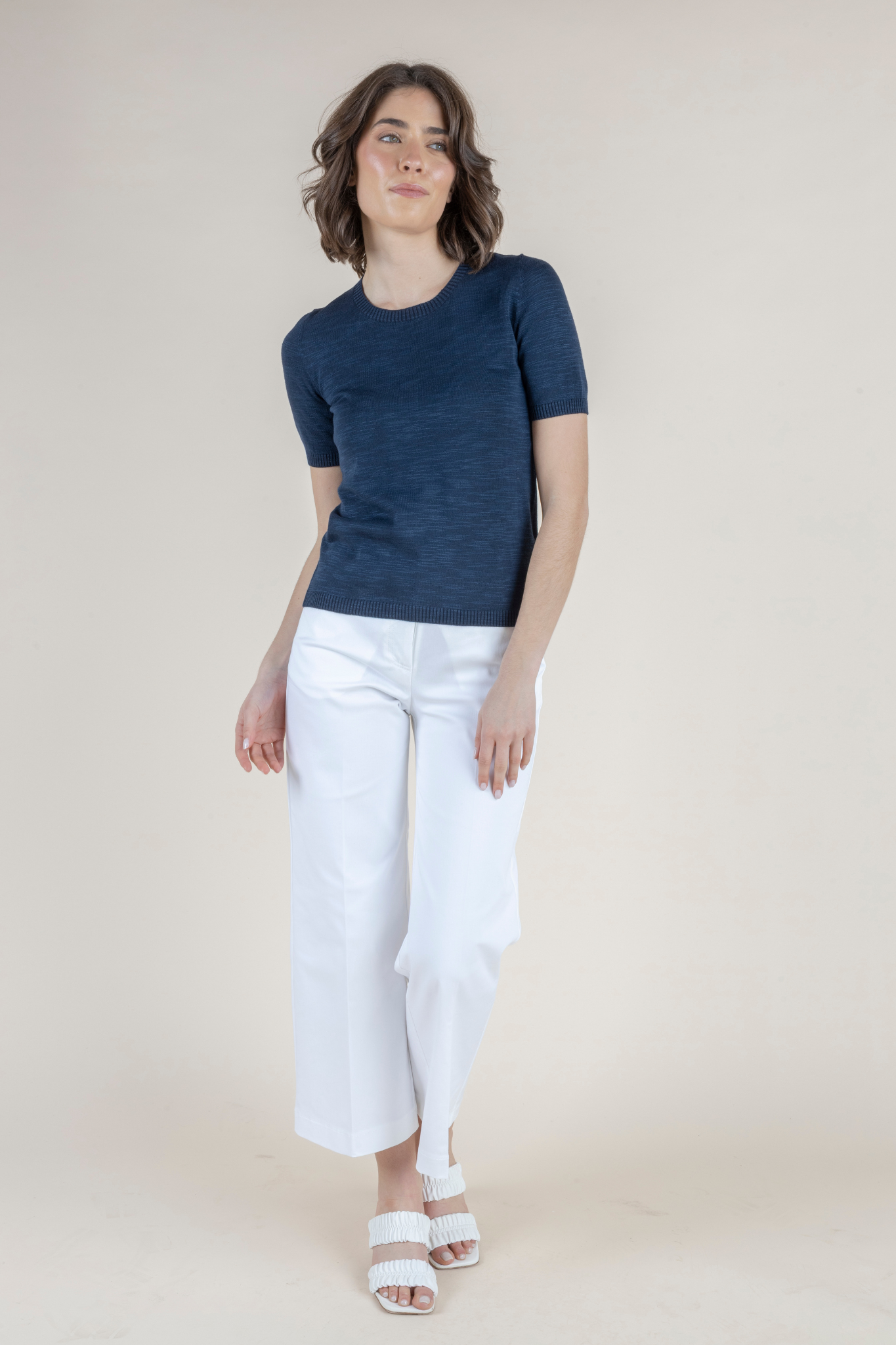 An elevated take on a short sleeve tee, the Sarnen is a fantastic option for the warm weather season. Available in both white and notte/dark navy, this knit tee is finished in a soft and breathable cotton and viscose blend and features a short hem, perfect for pairing with high waisted skirts, shorts and pants