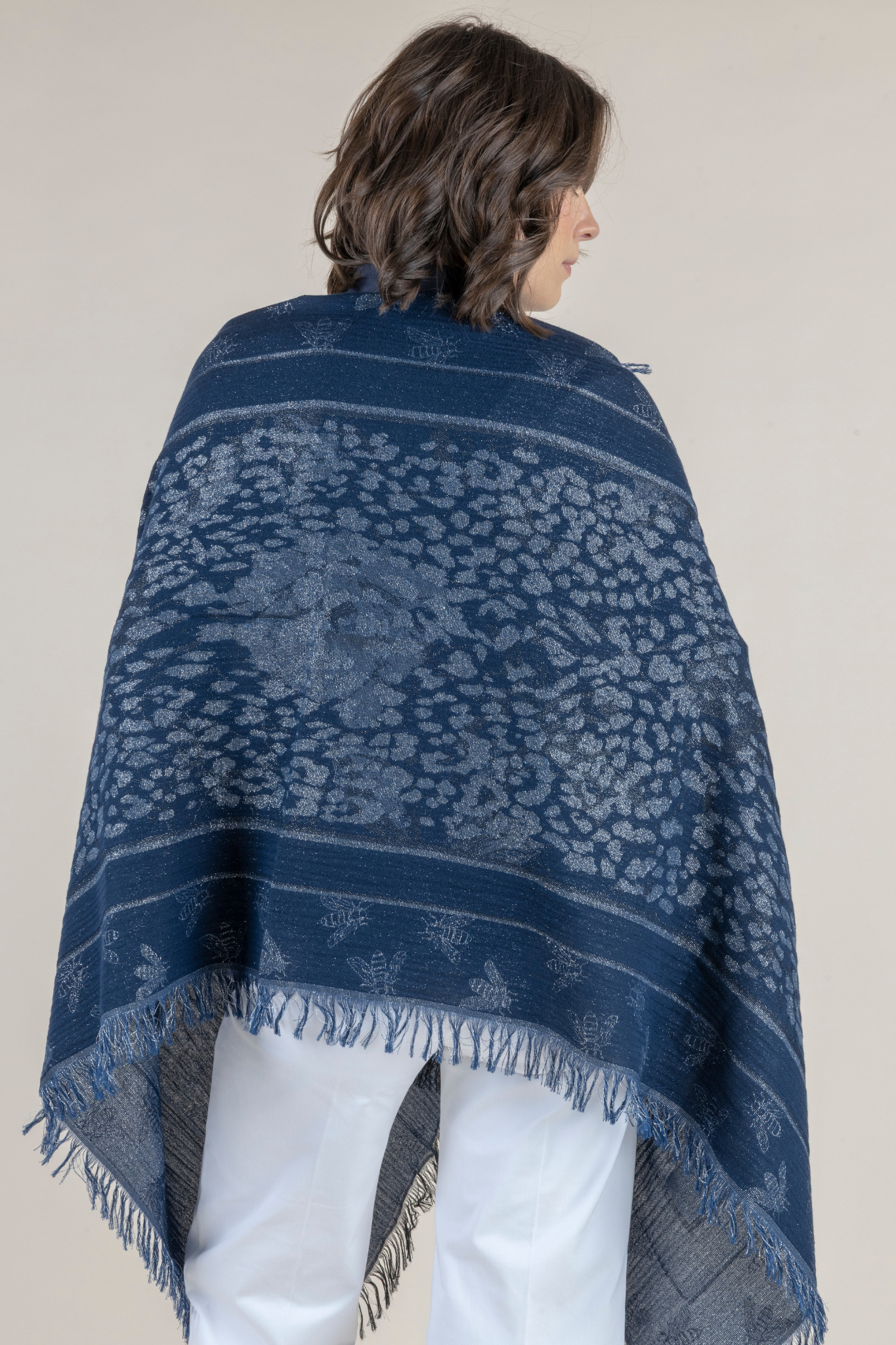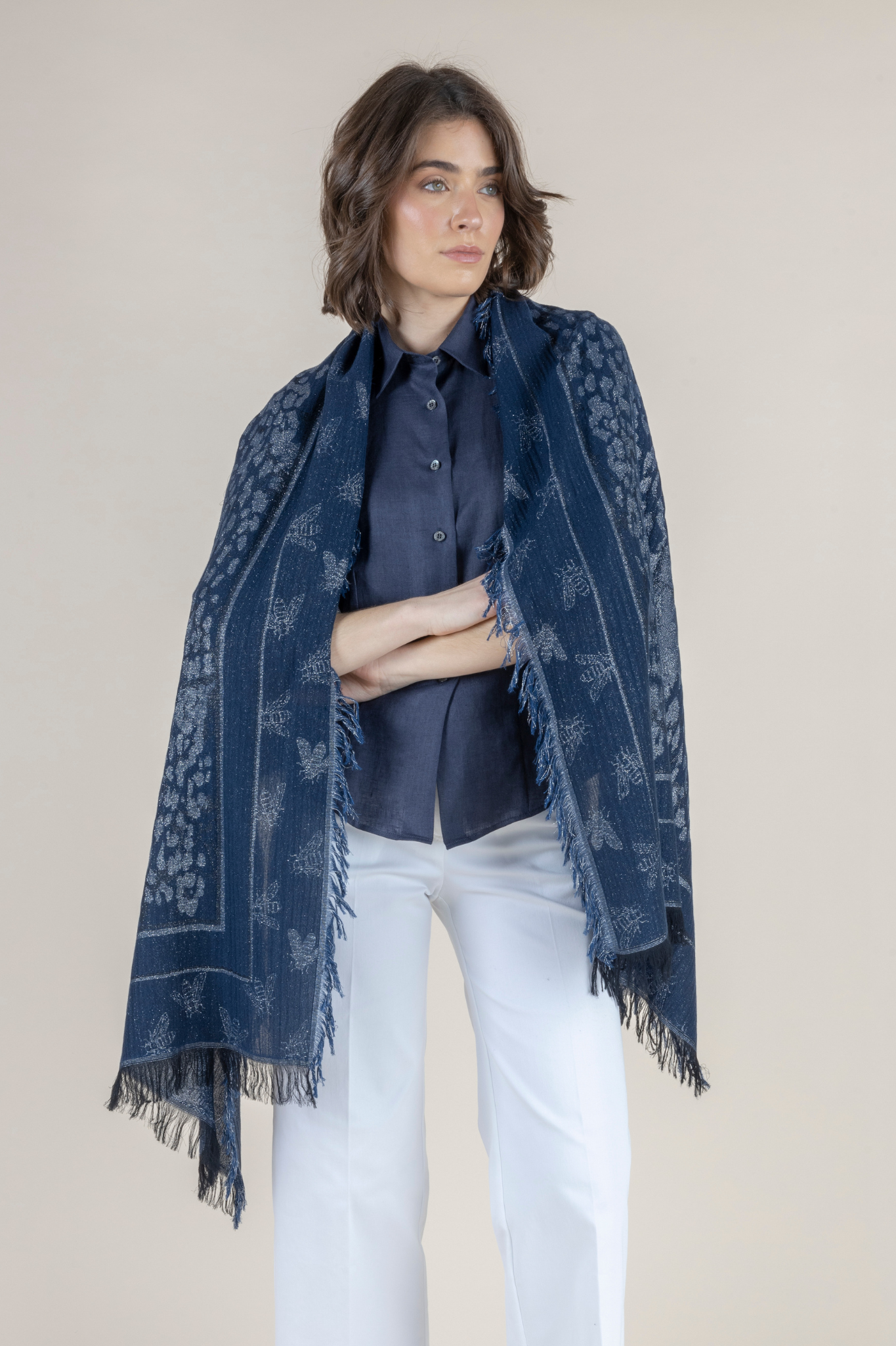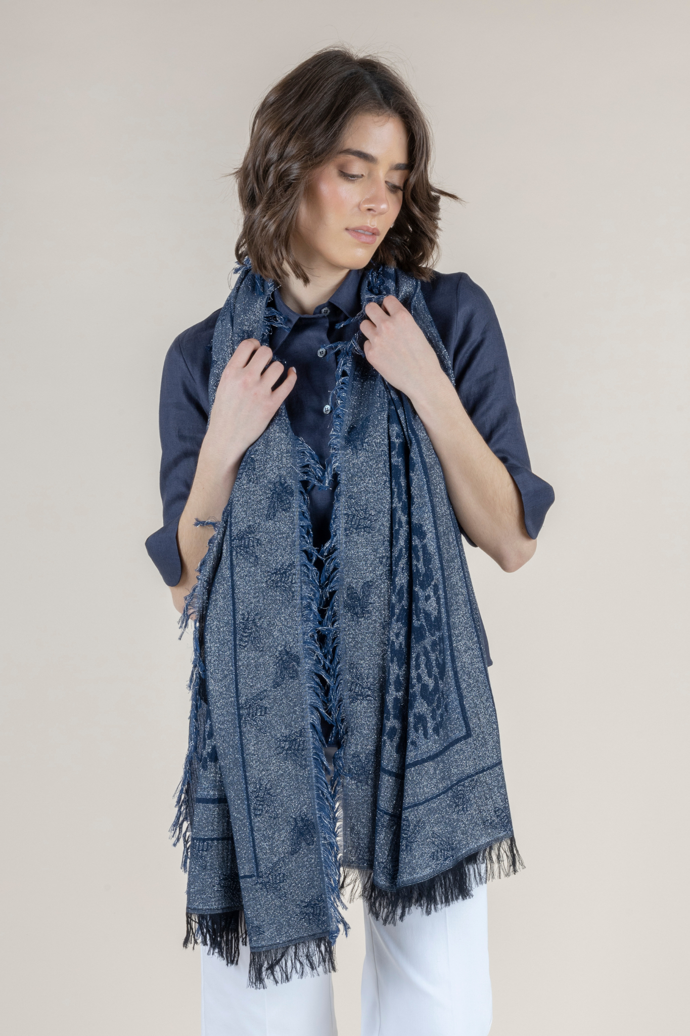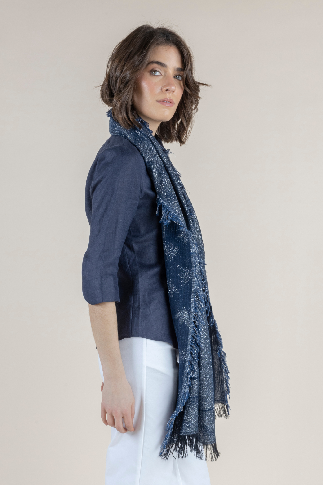 Woven in a sophisticated blend of deep indigo and soft silver tones, this lightweight scarf features an intricate pattern that adds subtle dimension and understated shine. Crafted from a breathable modal-cotton blend, the Ubi Scarf feels luxuriously soft against the skin while offering beautiful drape and fluid movement. Finished with delicate fringe edges, it layers seamlessly over blouses, dresses, and tailoring — adding polish without weight. Whether worn casually draped, wrapped for warmth, or styled as a statement accent, this timeless accessory elevates any look with effortless European sophistication