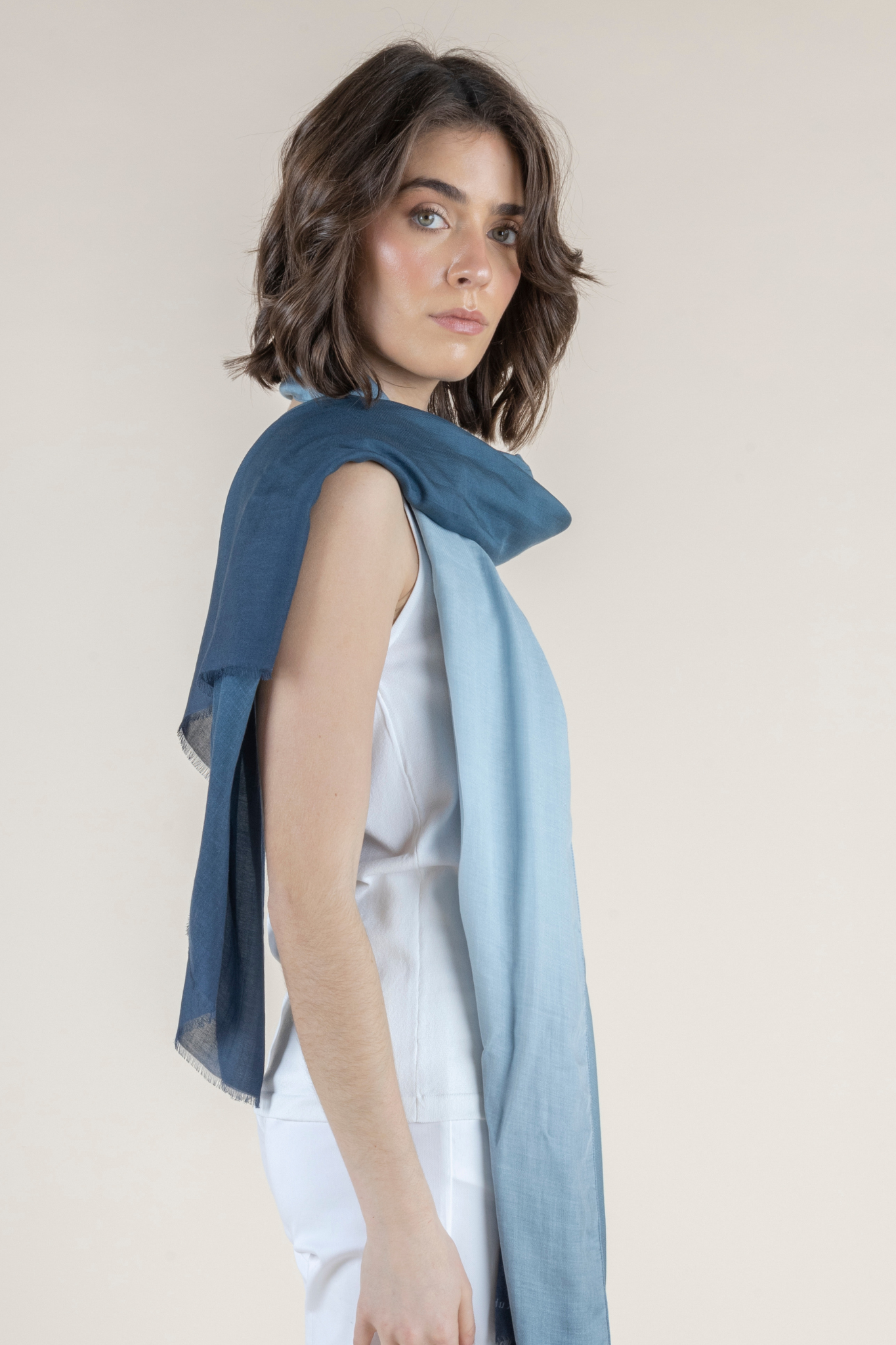 Elevate your everyday wardrobe with the effortless elegance of the Urto Scarf — a beautifully fluid accessory that brings softness, color, and movement to any look. Crafted in Naples, Italy from luxuriously lightweight 100% modal, this refined scarf drapes gracefully for a polished yet relaxed feel. Designed with a striking gradient color transition, the Urto Scarf adds depth and dimension while remaining endlessly versatile. Whether worn loosely over the shoulders, wrapped around the neck, or styled as a statement layer, its airy texture and silky hand feel make it a year-round essential. Available in two color combinations, each palette offers a sophisticated blend of tones that pair beautifully with both neutrals and seasonal hues — making the Urto Scarf a timeless finishing touch for any wardrobe