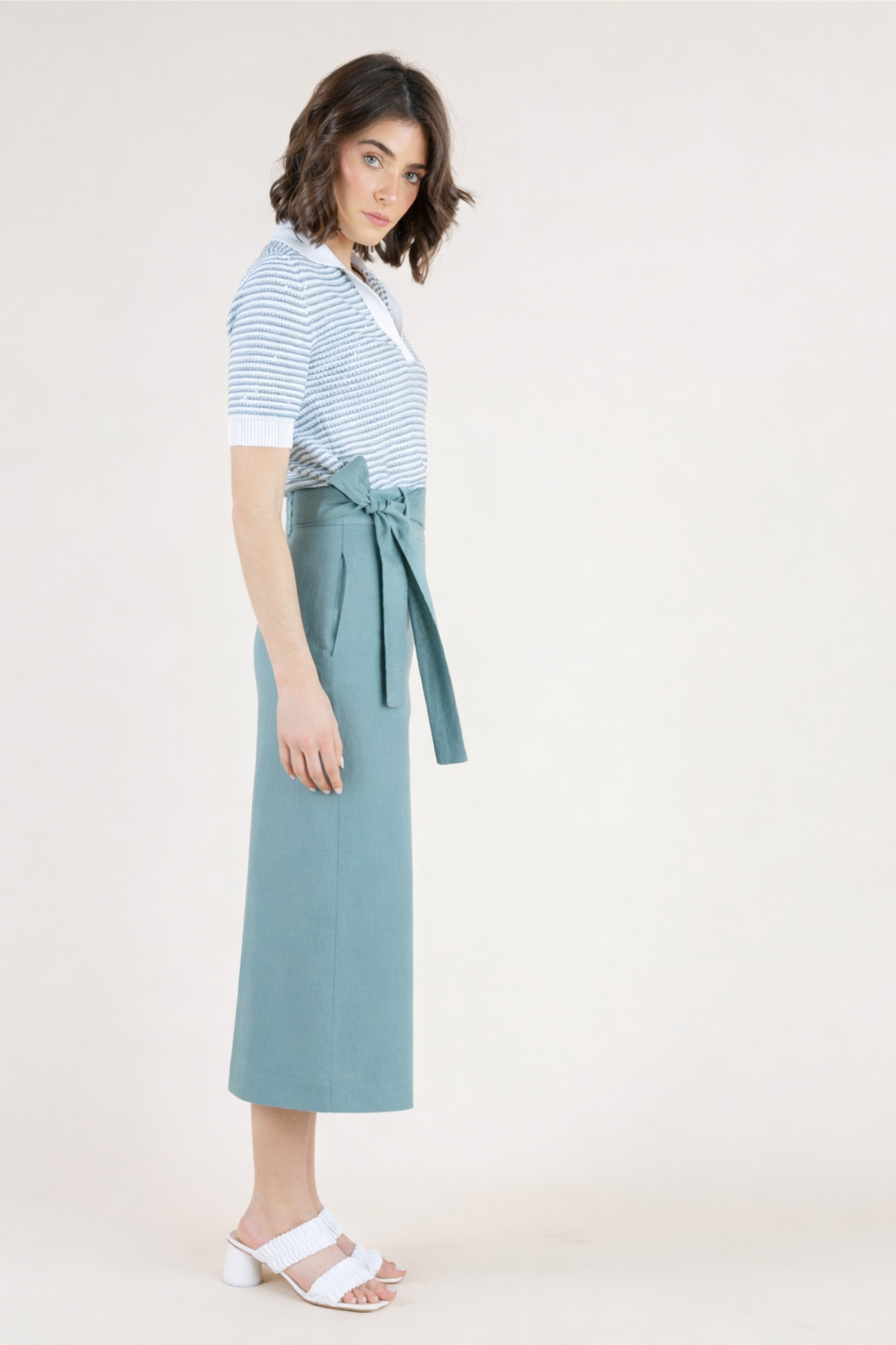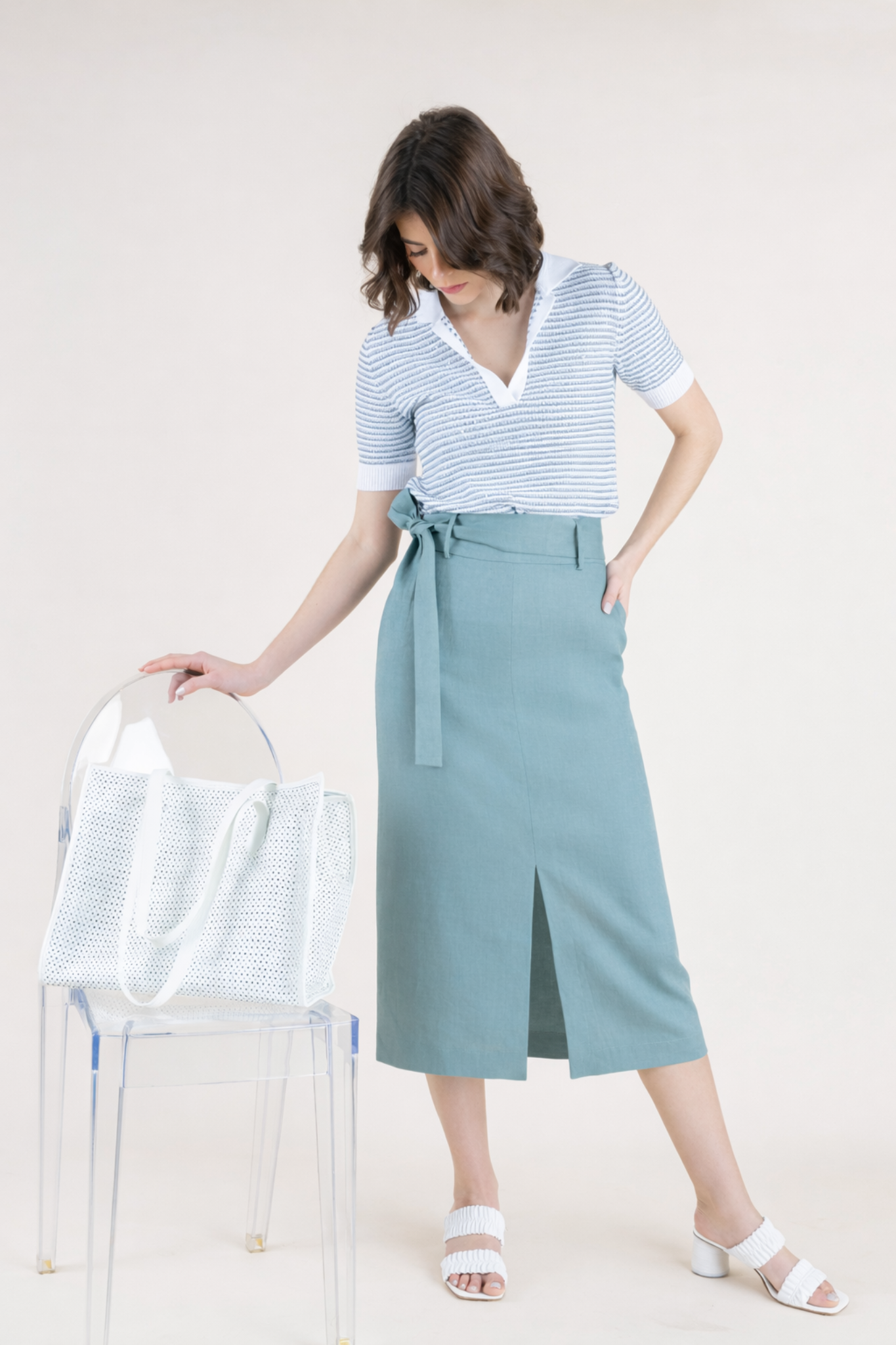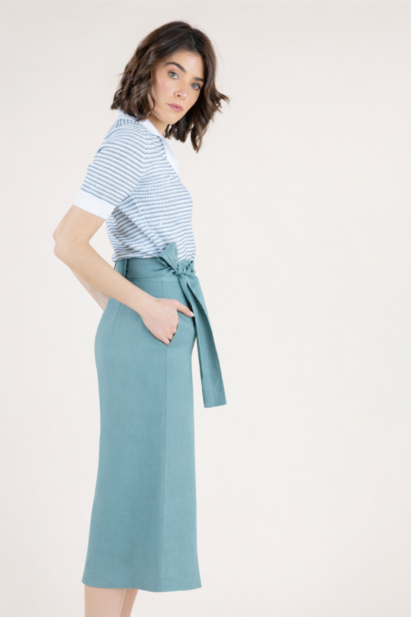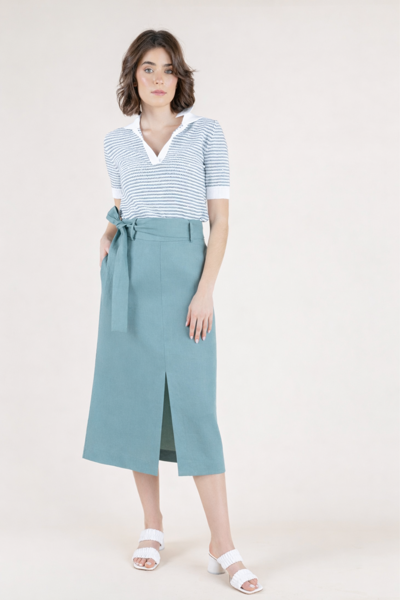 Effortlessly elegant, this linen skirt from Amina Rubinacci’s SS 2026 Collection is a warm-weather essential in a fresh thyme green hue. Crafted in Italy from 100% breathable linen, it features a flattering mid to high-rise waist with a self-tie belt that cinches the silhouette beautifully. The midi length and subtle front slit add graceful movement and a touch of allure, making it perfect for both casual days and elevated evenings. Timeless yet modern, this skirt pairs seamlessly with everything from crisp tanks to lightweight knits