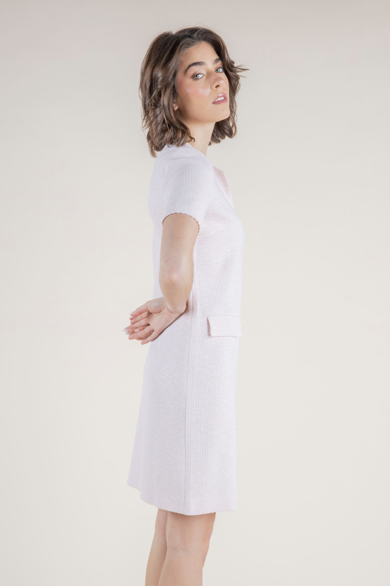 The Vallo Dress from Amina Rubinacci’s SS 26 Collection is a refined expression of modern femininity, designed with clean lines and subtle texture for an effortlessly polished look. Rendered in the delicate Quarzo Rosa Bianco hue, this soft blush tone brings a luminous, sophisticated freshness to the silhouette.Crafted from a beautifully structured cotton-viscose blend, the Vallo features a gently textured finish that adds dimension while maintaining a smooth, tailored appearance. The streamlined shape skims the body with elegant simplicity, while short sleeves and a softly notched neckline create a flattering, contemporary frame. Subtle pocket detailing enhances the design with a touch of understated structure. Vallo is gorgeous on its own but also pairs nicely with the Vulcano Jacket