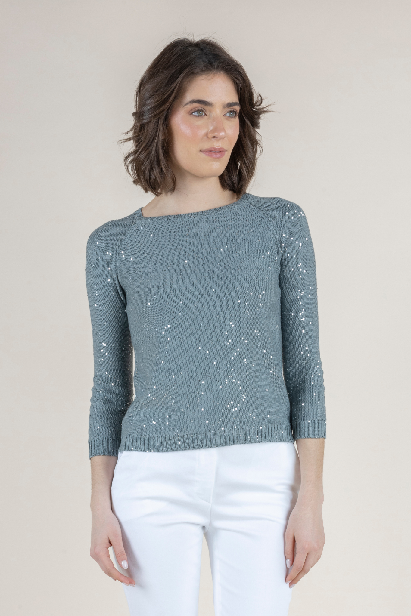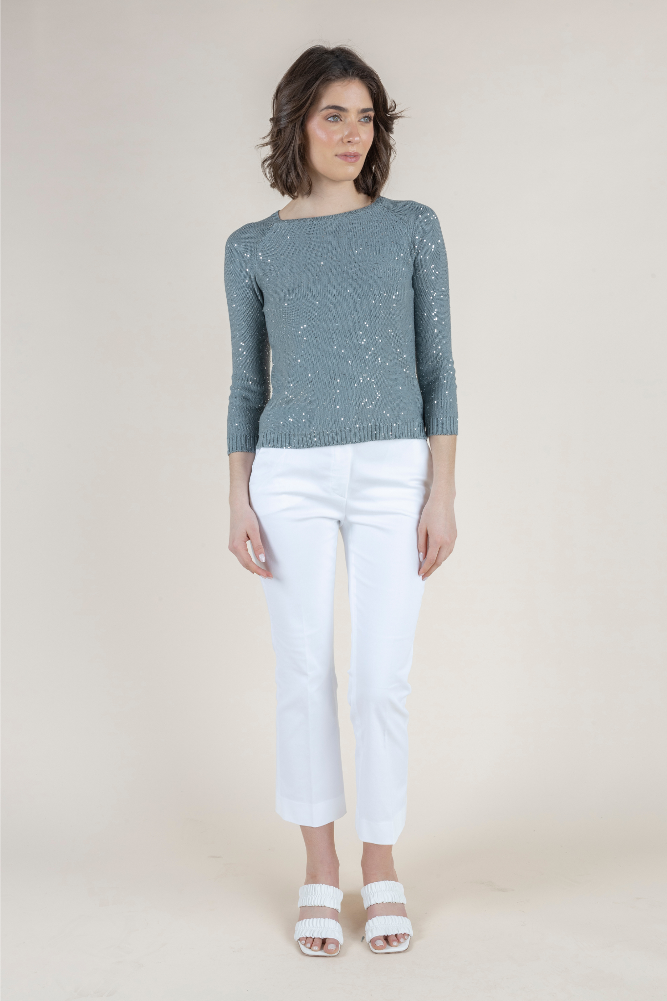 Delicate shimmer meets everyday elegance in the Valore Sweater — a refined knit designed to bring effortless polish to your wardrobe. Crafted from a breathable cotton blend, this beautifully fitted silhouette features a soft, lightweight feel with subtle sparkle woven throughout for a hint of understated glamour. The clean neckline and flattering shape make it perfect for dressing up tailored trousers or pairing casually with denim. Sophisticated yet easy to wear, the Valore is a versatile piece you’ll reach for season after season. Valore is available two swoon worthy shades: a crisp denim blue and an ethereal thyme green
