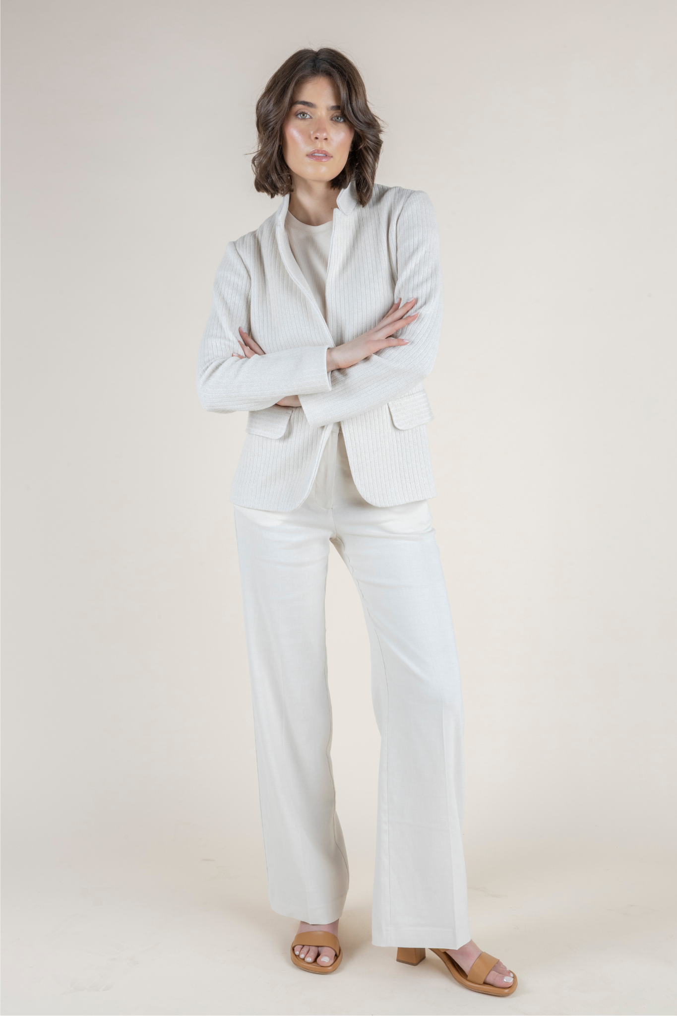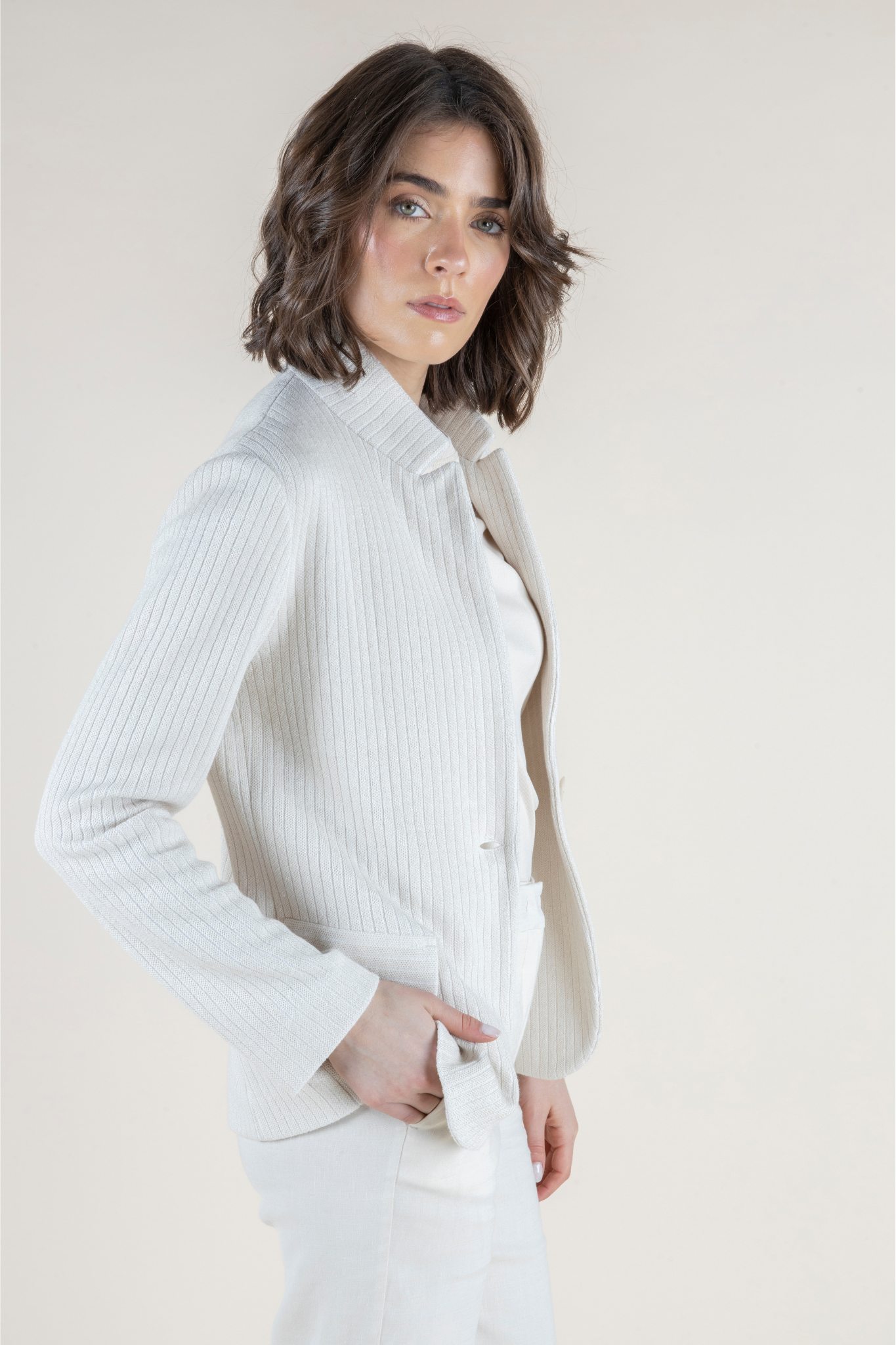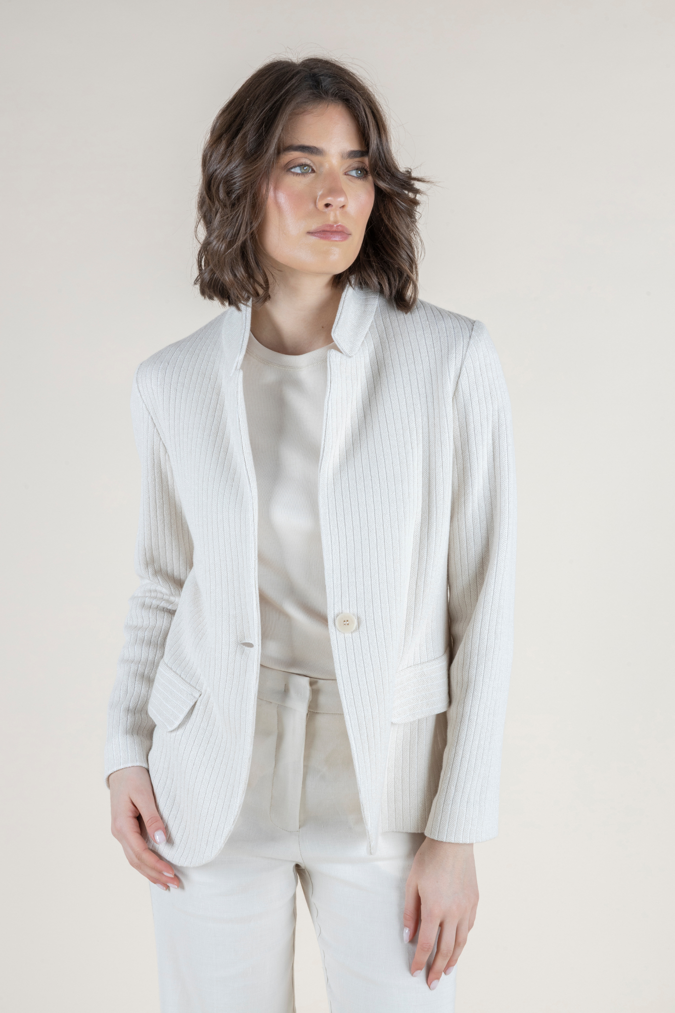 Tailored yet effortless, this refined jacket from Amina Rubinacci’s SS 2026 Collection is reimagined in a soft Sesamo Bianco hue for a fresh, neutral finish. Crafted in a breathable linen and cotton blend, it features a subtle ribbed texture that adds dimension while maintaining a lightweight feel—perfect for warmer days. Designed with a classic notched lapel, single-button closure, and flap pockets, this piece offers a flattering, feminine silhouette with just the right amount of structure. Whether styled with coordinating trousers or layered over a simple tank, it delivers polished versatility for everyday wear