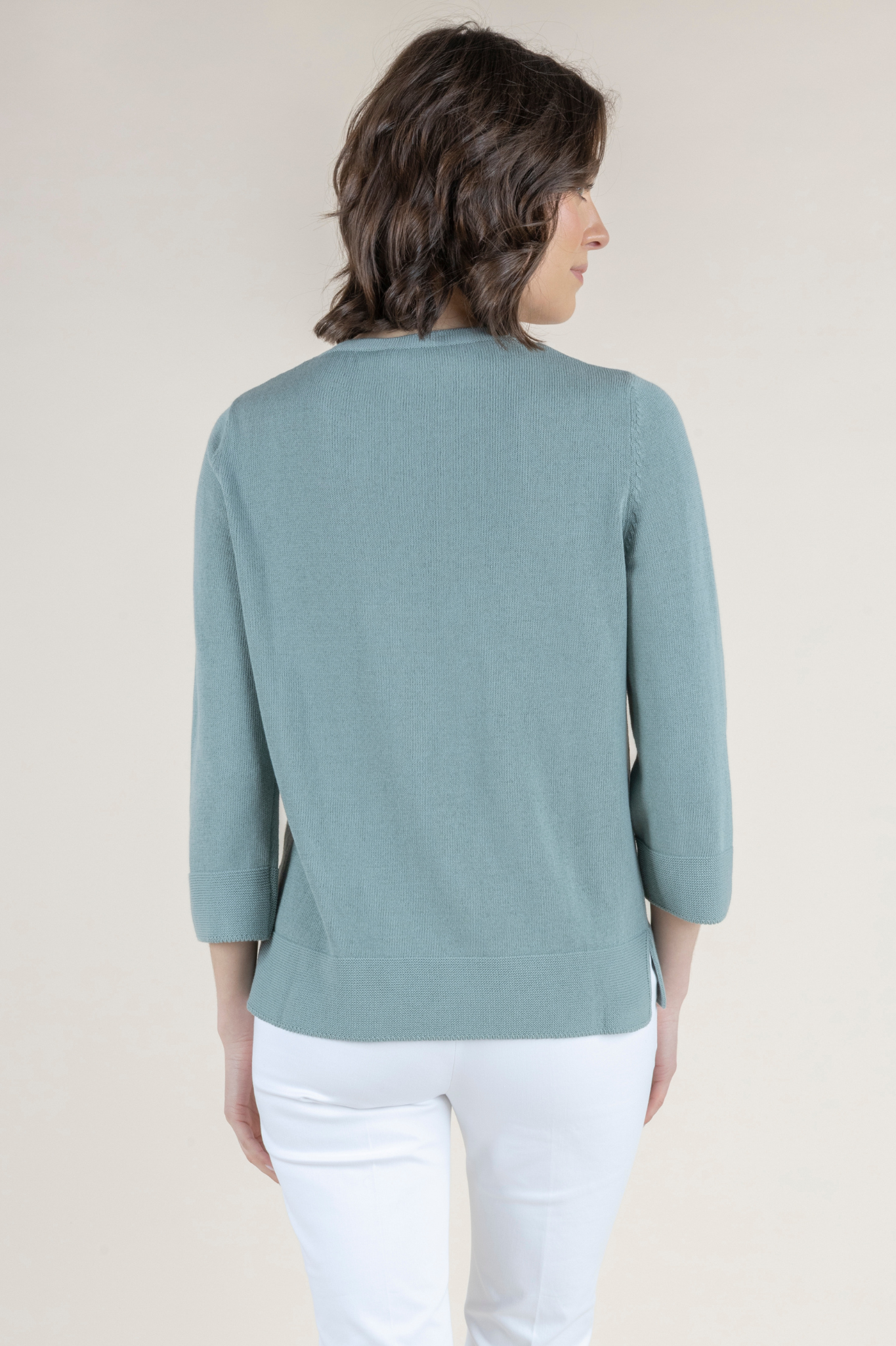 The Vezzo is a refined knit essential that captures understated elegance and everyday versatility. Crafted from 100% cotton, it offers a soft, breathable feel with a smooth, lightweight finish ideal for warm-weather wear. Designed with a clean, minimalist silhouette, Vezzo features a classic round neckline and three-quarter-length sleeves, lending it a timeless, easy-to-style appeal. Subtle ribbed detailing at the neckline, cuffs, and hem provides gentle structure, while the fluid drape ensures a flattering, comfortable fit. Available in bianco (white) for a crisp, fresh look, timo (thyme) for a muted, natural tone, and rosso (red) for a bold, vibrant statement, the Vezzo Sweater transitions effortlessly from casual daytime dressing to more polished ensembles. Whether worn on its own or layered, it reflects Amina Rubinacci’s signature balance of comfort, sophistication, and modern simplicity.