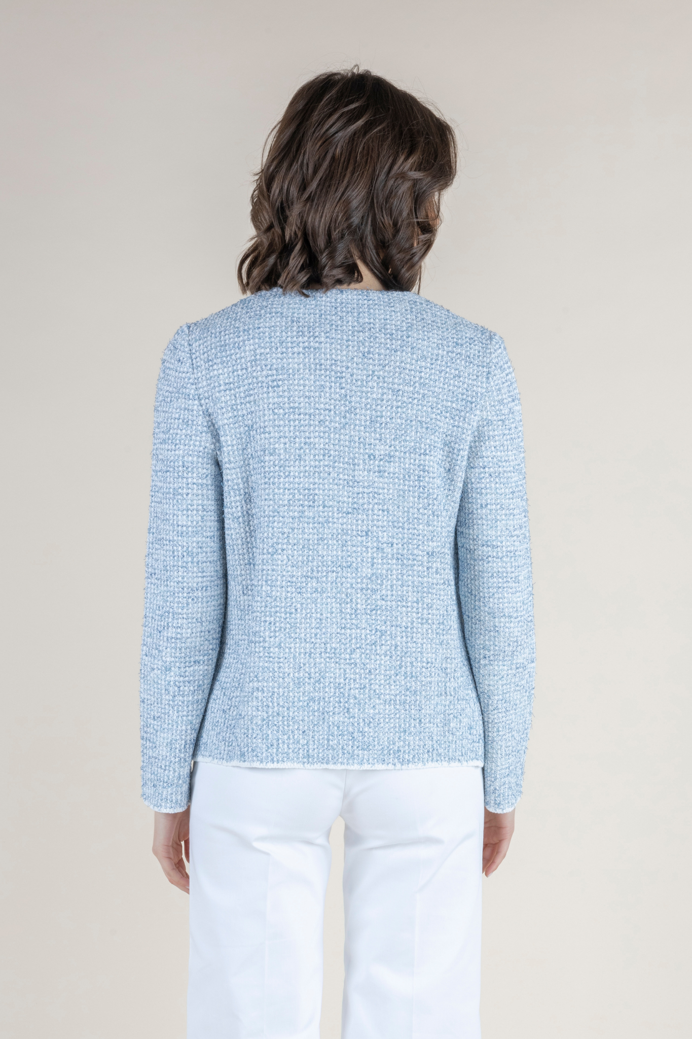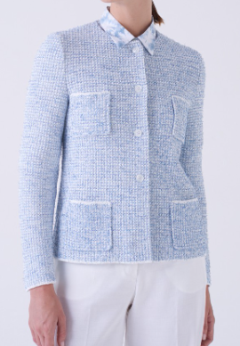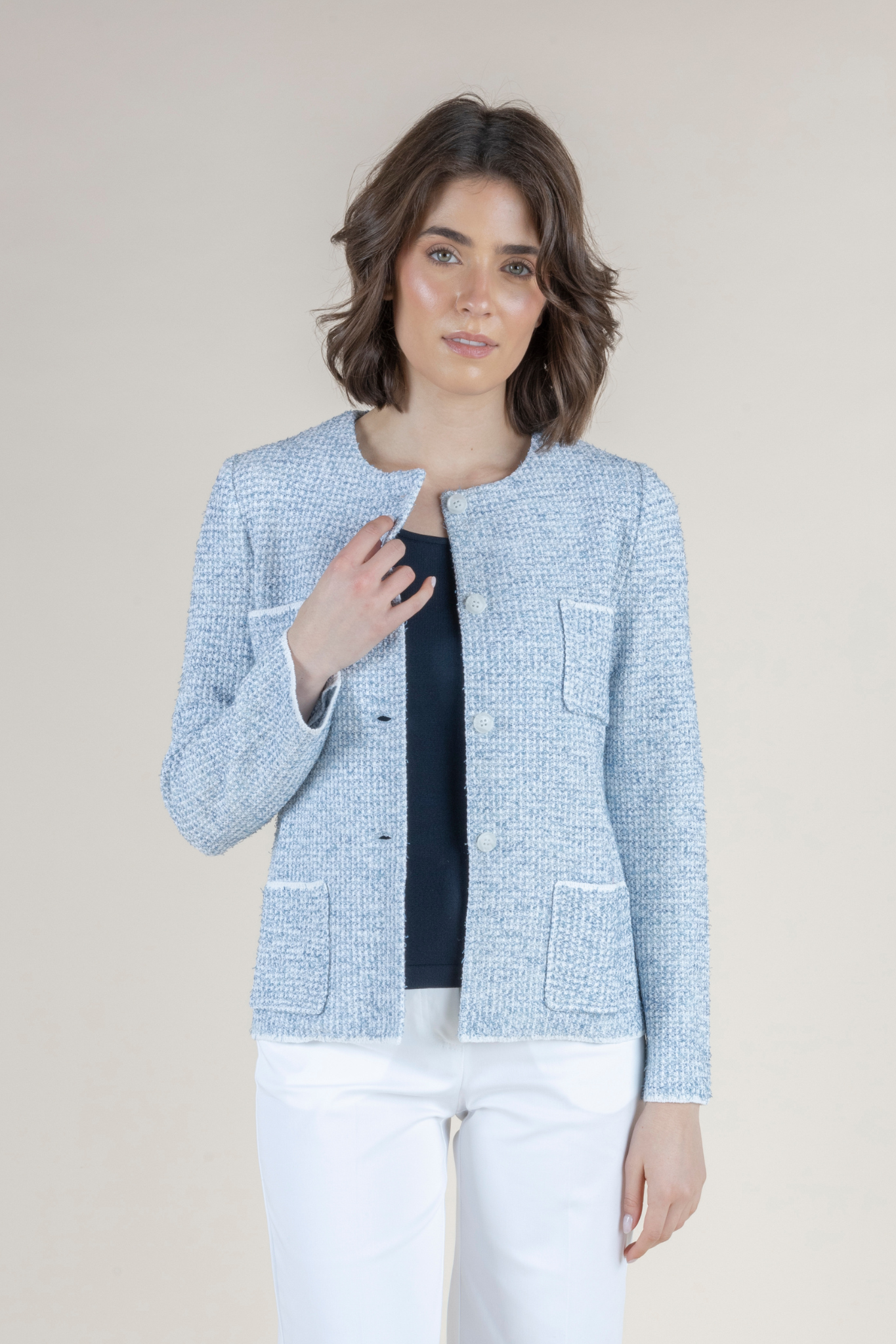 The Vicky Jacket is a polished, contemporary knit that captures the brand’s signature balance of structure and ease. Designed with a clean, tailored silhouette, the jacket features a collared neckline and a button-through front, lending it a modern, jacket-like finish while maintaining the comfort of knitwear. The textured weave adds visual depth, while the four patch pockets—two at the chest and two at the waist—introduce a soft utility-inspired detail. Long sleeves and a hip-length cut complete the streamlined shape. Elegant and versatile, the Vicky Jacket is ideal worn with crisp trousers or layered over dresses, making it a sophisticated choice for warm-weather dressing and effortless day-to-evening transitions