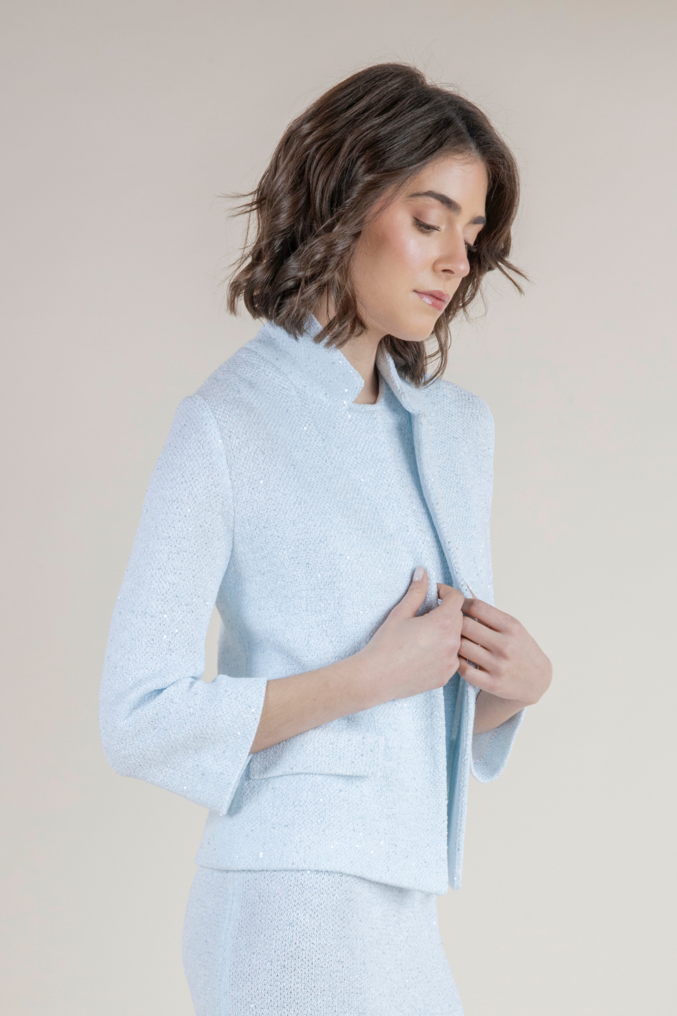 The Virtual Jacket is a feminine piece crafted in a delicate azul bianco hue. Cut in a softly structured silhouette, it features a clean notched lapel, a single-breasted front, and three-quarter-length sleeves that enhance its light, elegant feel. The fabric is subtly enriched with fine paillettes woven throughout, catching the light with a discreet shimmer that adds depth and sophistication without overwhelming the design. Finished with flap pockets and a smooth, tailored back, the jacket balances polish and ease, making it ideal for both daytime elegance and elevated occasion wear. Overall, the Virtual jacket embodies understated luxury—timeless tailoring infused with a modern, luminous touch. Virtual pairs beautifully with the Vito Dress