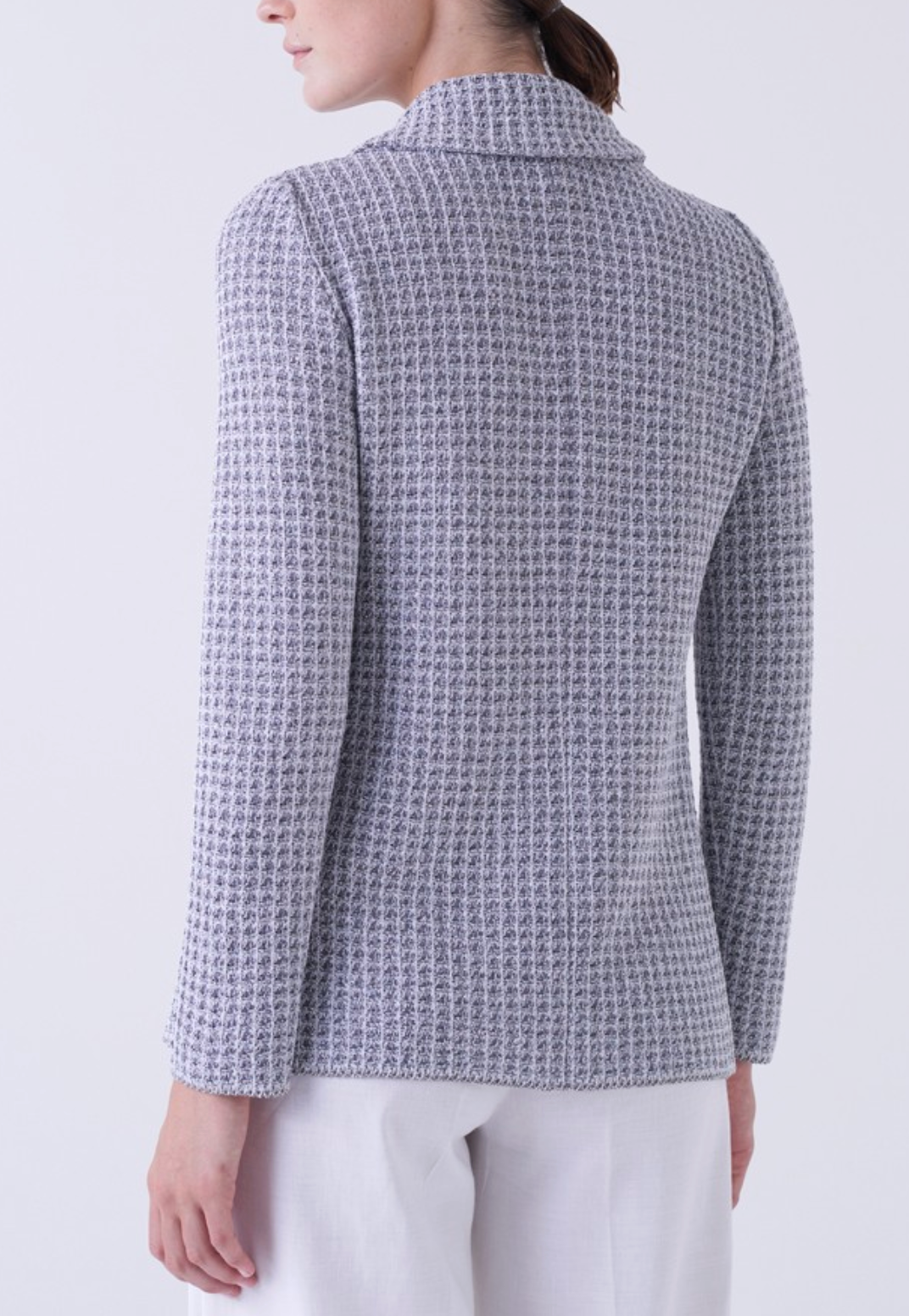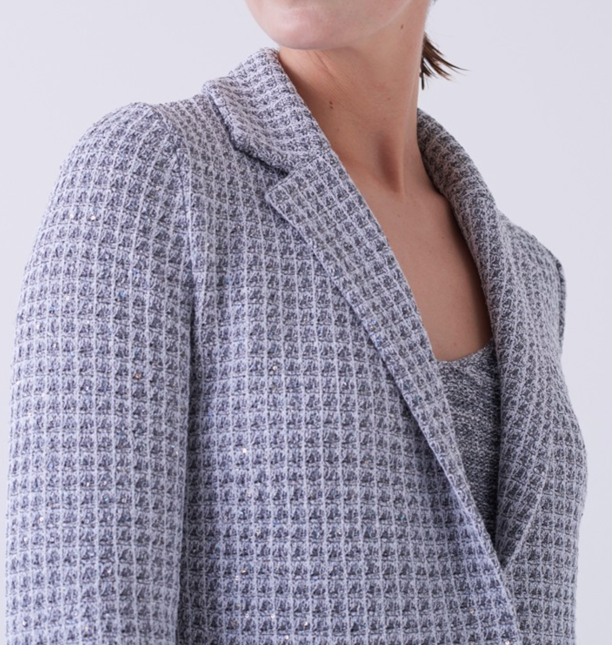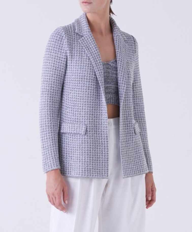 The Virtude jacket is a polished, contemporary design finished in an elegant bianco graphite palette. Defined by a softly tailored silhouette, it features a classic notched lapel, a single-breasted front, and long sleeves that lend it a refined yet relaxed structure. The textured fabric is woven with subtle paillettes throughout, introducing a gentle shimmer that enhances the jacket’s depth and visual interest while maintaining a restrained, sophisticated appeal. Thoughtfully placed flap pockets complete the design, reinforcing its tailored character. Versatile and modern, the Virtude jacket effortlessly bridges day and evening, offering understated glamour with a clean, architectural finish