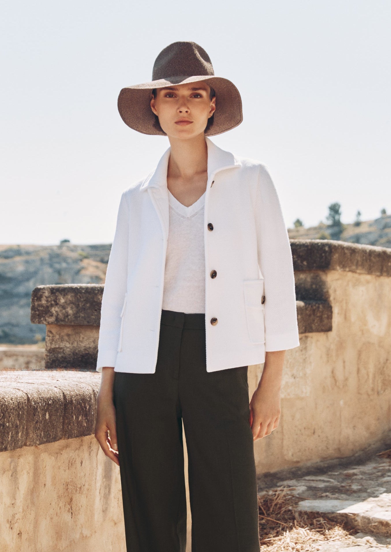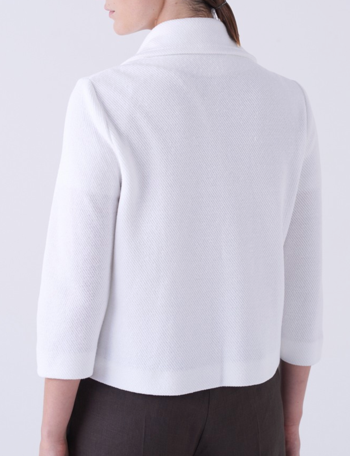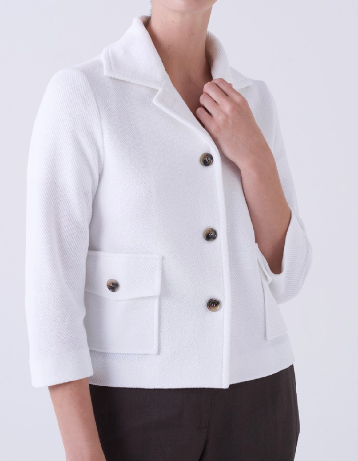 The Volonta Jacket is a crisp, modern take on classic tailoring, designed to embody lightness and understated sophistication. Finished in a clean white hue, it offers a fresh, summery elegance that feels both timeless and contemporary. Cut with a structured yet relaxed silhouette, the Volonta Jacket features a soft notched collar, a single-breasted front with tonal buttons, and three-quarter-length sleeves that enhance its effortless, warm-weather appeal. The front patch pockets with buttoned flaps introduce a subtle utilitarian note, balancing polish with practicality. Crafted from a linen and cotton blend, the fabric delivers natural breathability and a lightly textured hand feel, ideal for spring and summer layering