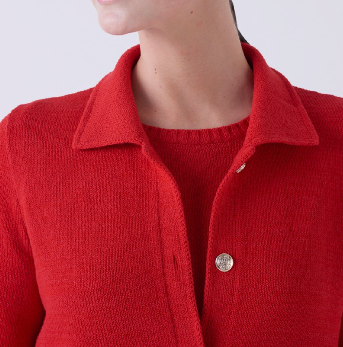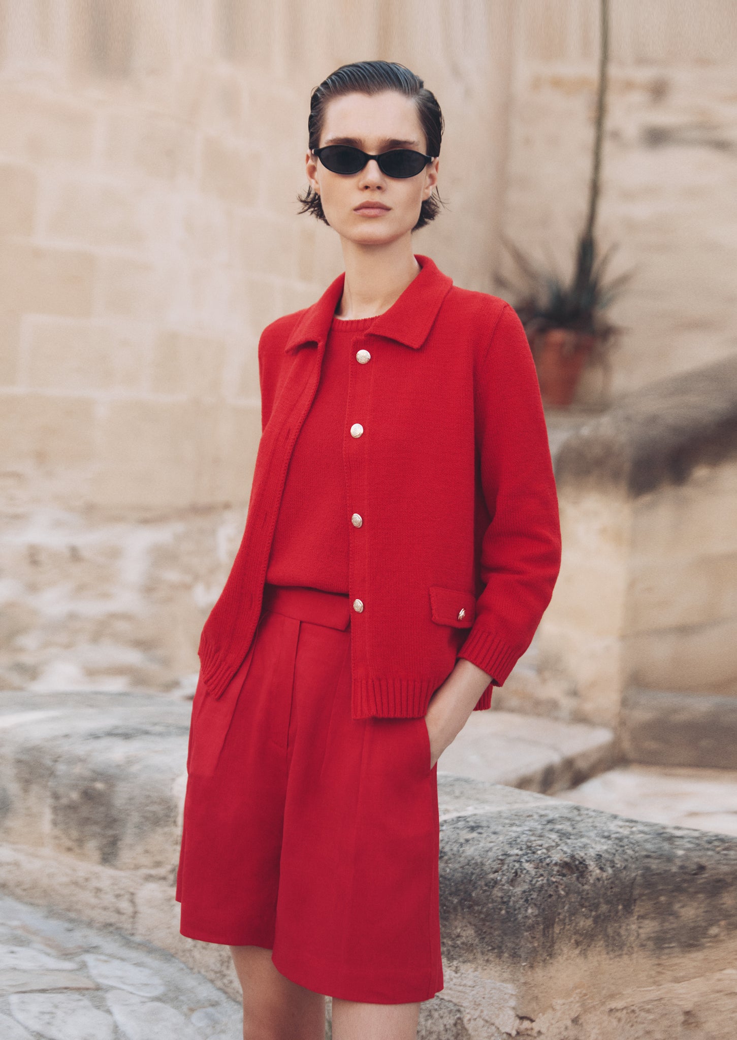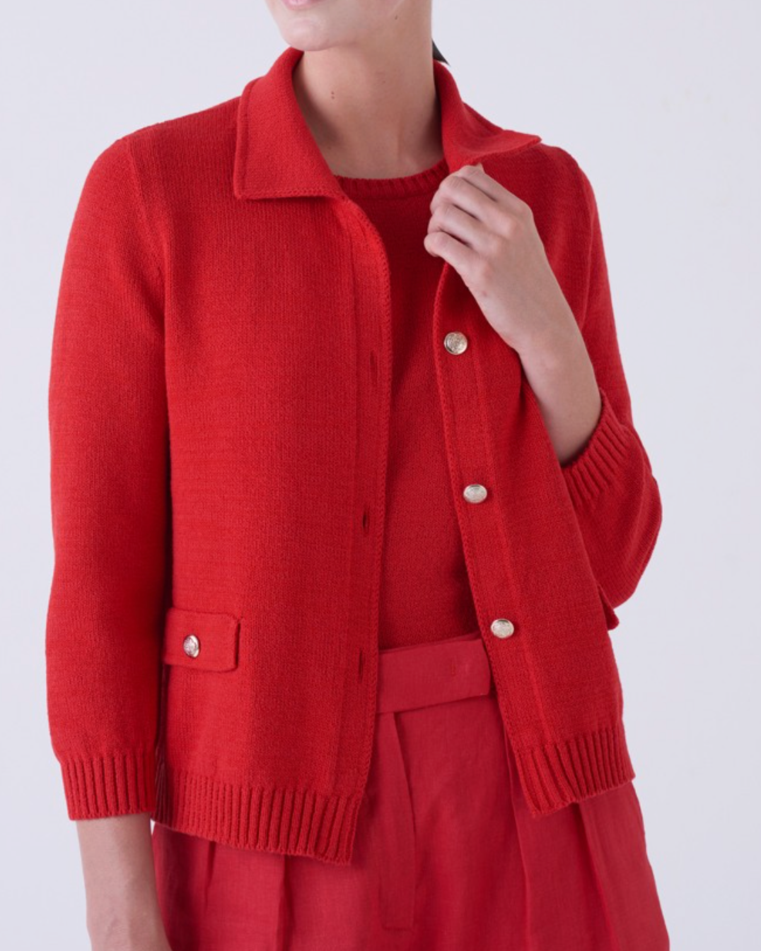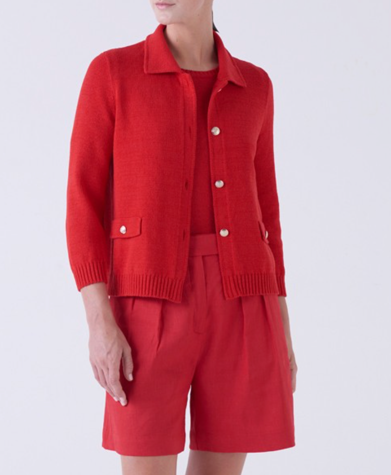 Striking and sophisticated, the Vitality Jacket from Amina Rubinacci’s SS 2026 Collection is a true statement piece in the season’s signature rosso red. Crafted from soft organic cotton, this lightweight knit jacket blends comfort with polished elegance. Designed with a classic collar, front button closure, and subtle ribbed trim, it offers a refined silhouette that feels both timeless and modern. Decorative flap pockets add a tailored touch, while the vibrant hue brings instant energy to any look. Perfectly styled over a matching top or paired with coordinating shorts or trousers, this jacket transitions seamlessly from casual daytime outings to elevated evening plans. A bold yet wearable essential, it captures the confident spirit of Amina’s spring/summer aesthetic