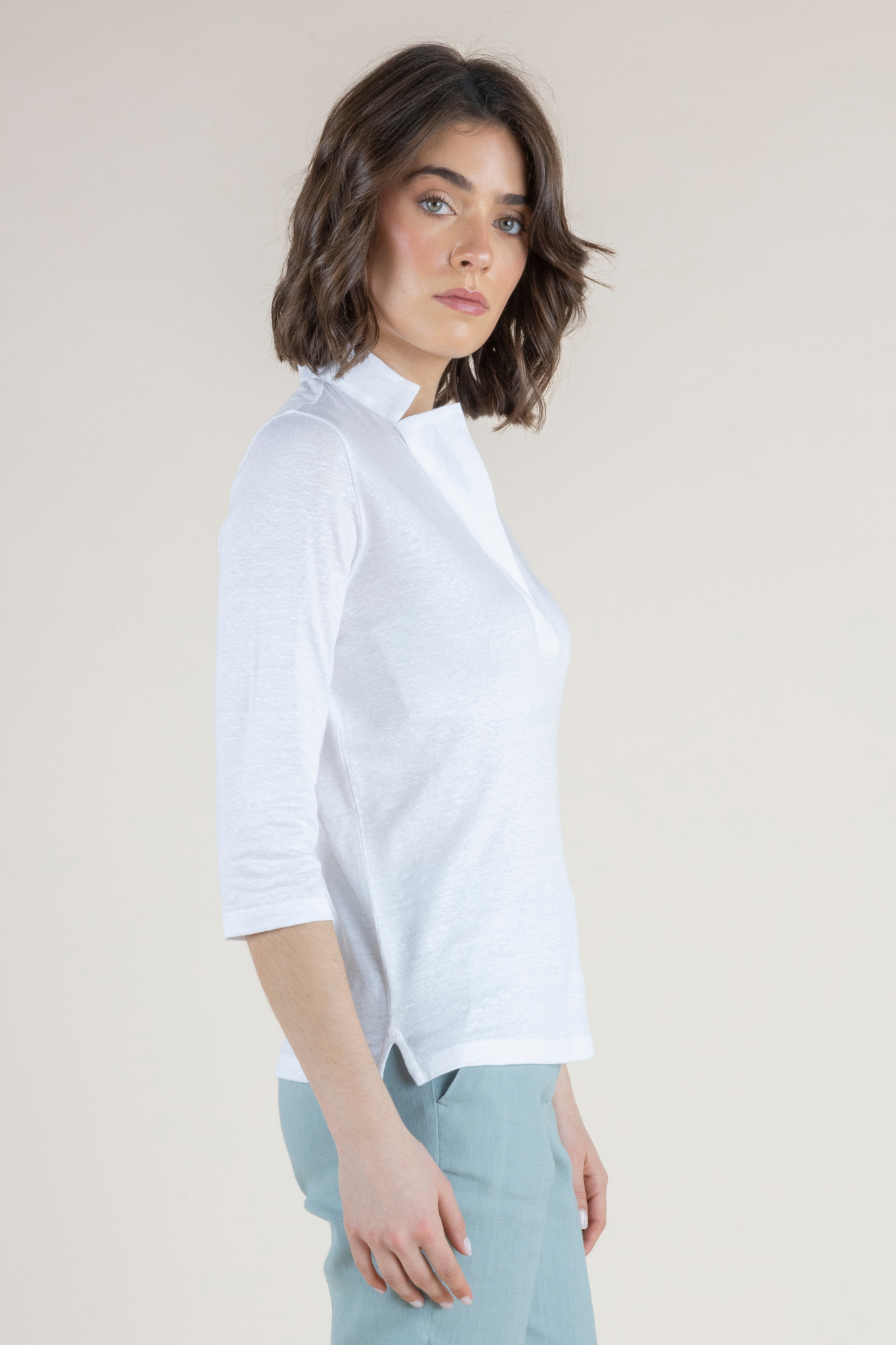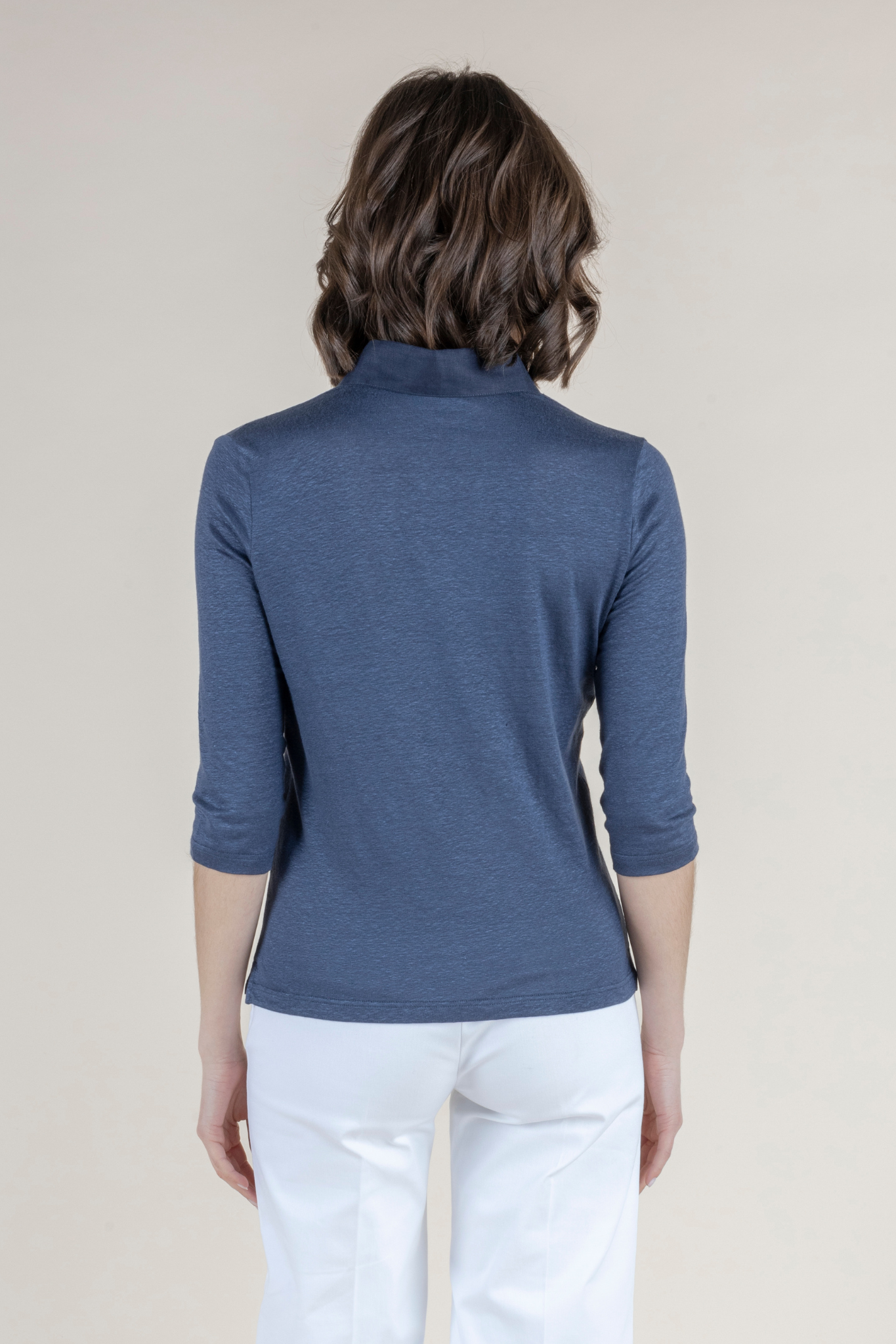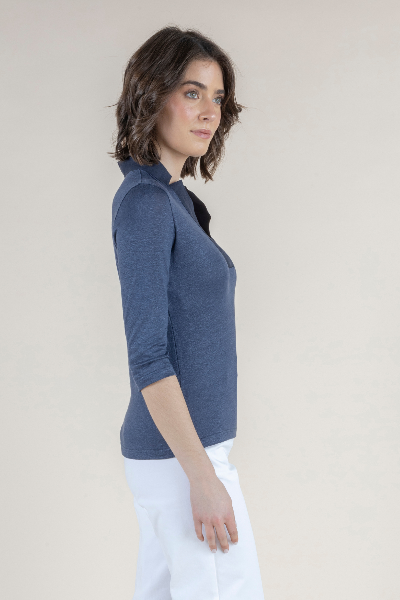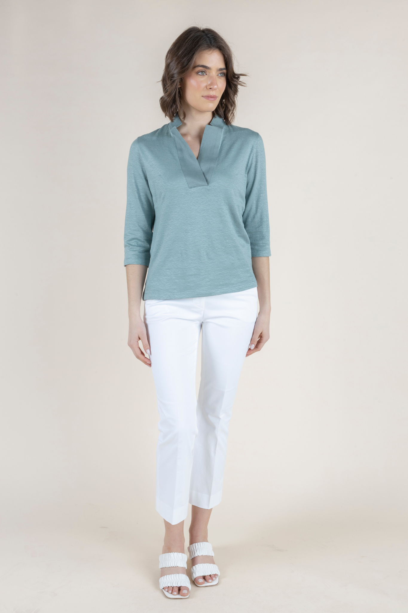 The Medaglia Top is a warm-weather essential that returns as a perennial best seller each spring and summer. Crafted from an airy linen blend with a touch of elastin, this top offers breathable comfort with gentle stretch, creating a silhouette that feels as good as it looks. Lightweight yet polished, it drapes beautifully on the body while maintaining its shape throughout the day. Designed with a flattering henley neckline and elegant three-quarter sleeves, the Medaglia Top strikes the perfect balance between relaxed and refined. Its versatile design makes it effortless to style—equally chic with tailored trousers, denim, or flowing skirts. Offered in a curated palette of Bianco, Timo (Thyme), Denim Chiaro, and Indaco (Indigo), each shade reflects the timeless sophistication and ease of Amina Rubinacci’s warm-weather collections. A true wardrobe staple, the Medaglia Top embodies Italian craftsmanship and everyday elegance, making it a piece you’ll reach for all season long