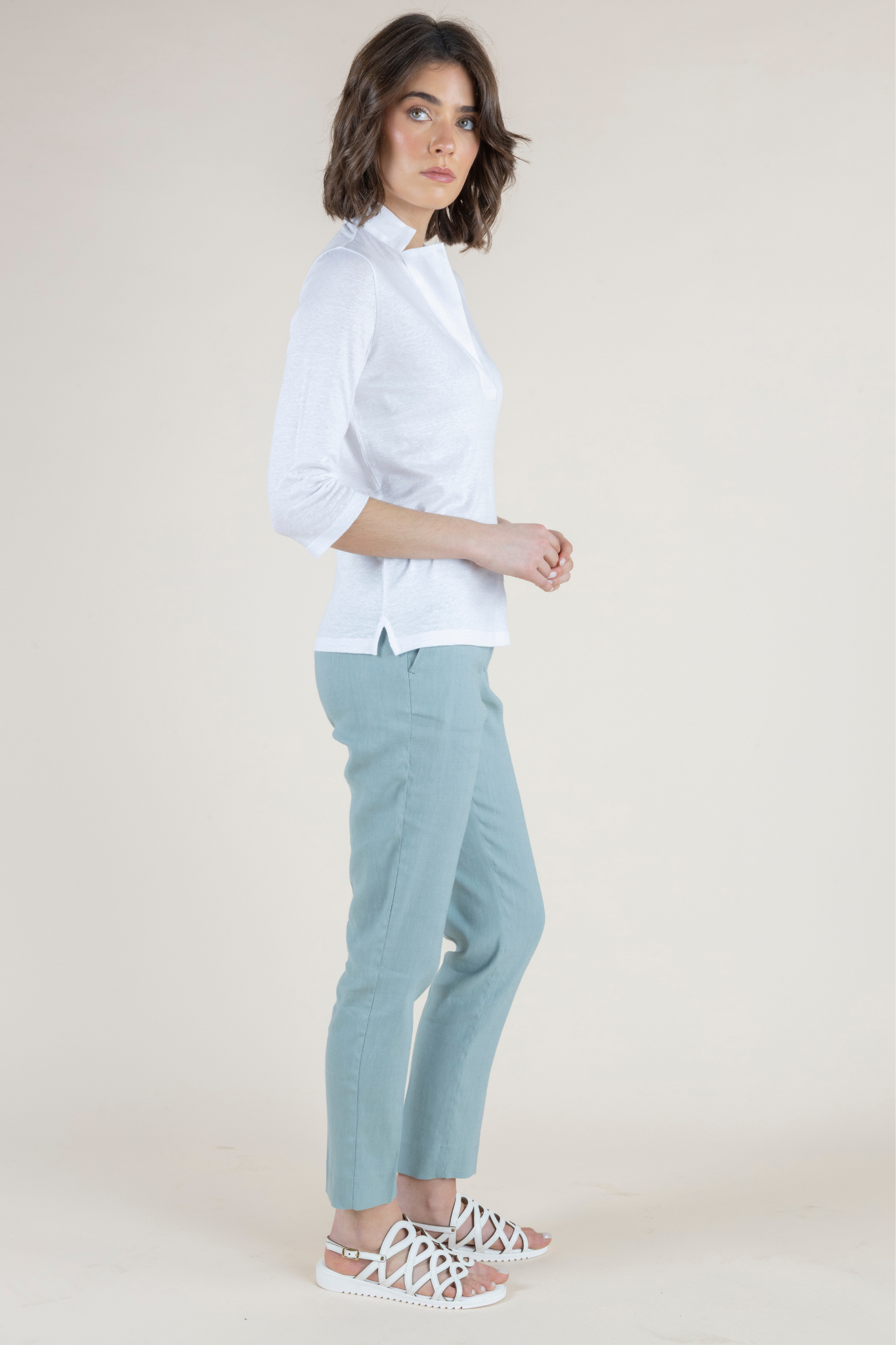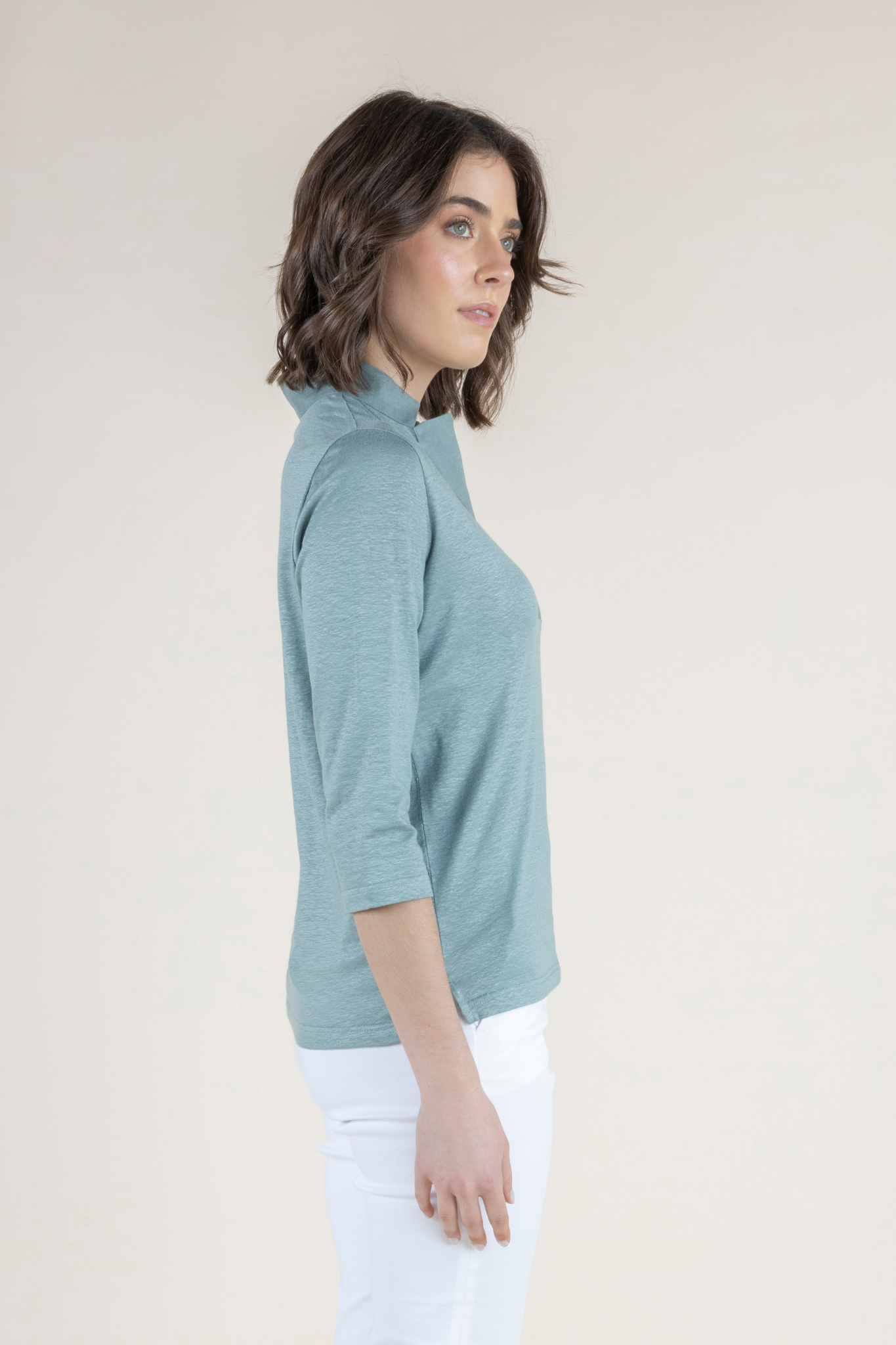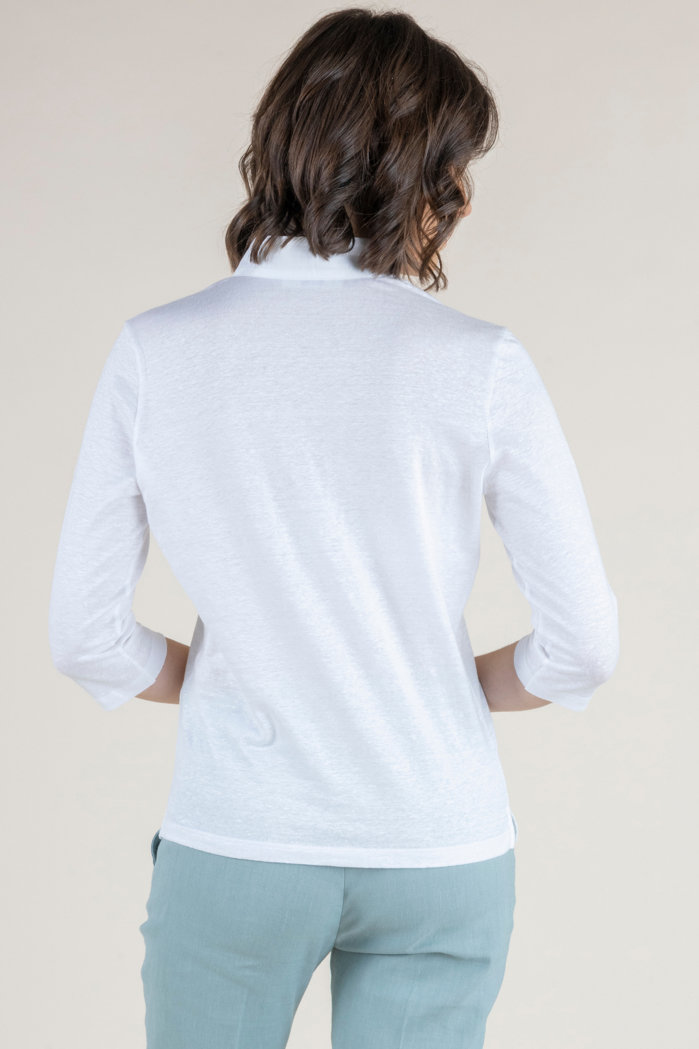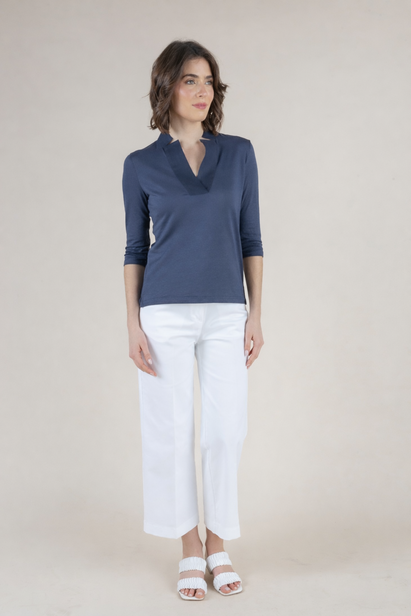 The Medaglia Top is a warm-weather essential that returns as a perennial best seller each spring and summer. Crafted from an airy linen blend with a touch of elastin, this top offers breathable comfort with gentle stretch, creating a silhouette that feels as good as it looks. Lightweight yet polished, it drapes beautifully on the body while maintaining its shape throughout the day. Designed with a flattering henley neckline and elegant three-quarter sleeves, the Medaglia Top strikes the perfect balance between relaxed and refined. Its versatile design makes it effortless to style—equally chic with tailored trousers, denim, or flowing skirts. Offered in a curated palette of Bianco, Timo (Thyme), Denim Chiaro, and Indaco (Indigo), each shade reflects the timeless sophistication and ease of Amina Rubinacci’s warm-weather collections. A true wardrobe staple, the Medaglia Top embodies Italian craftsmanship and everyday elegance, making it a piece you’ll reach for all season long